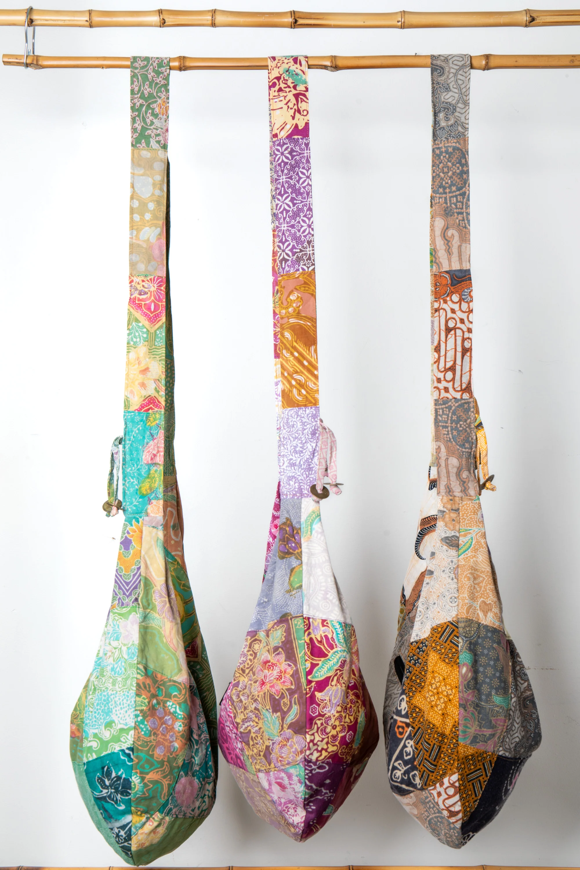 Every single Java Patch Moon Bag is a cosmic surprise! Crafted from reclaimed Balinese fabrics and designed with a dreamy patchwork of colors and patterns, this boho shoulder bag is 100% unique—just like you. You don’t get to choose your colorway because that’s half the fun! The bag you receive will be chosen by the universe, pulled from a kaleidoscope of bold prints and earthy tones, hand-dyed using the traditional Java technique.