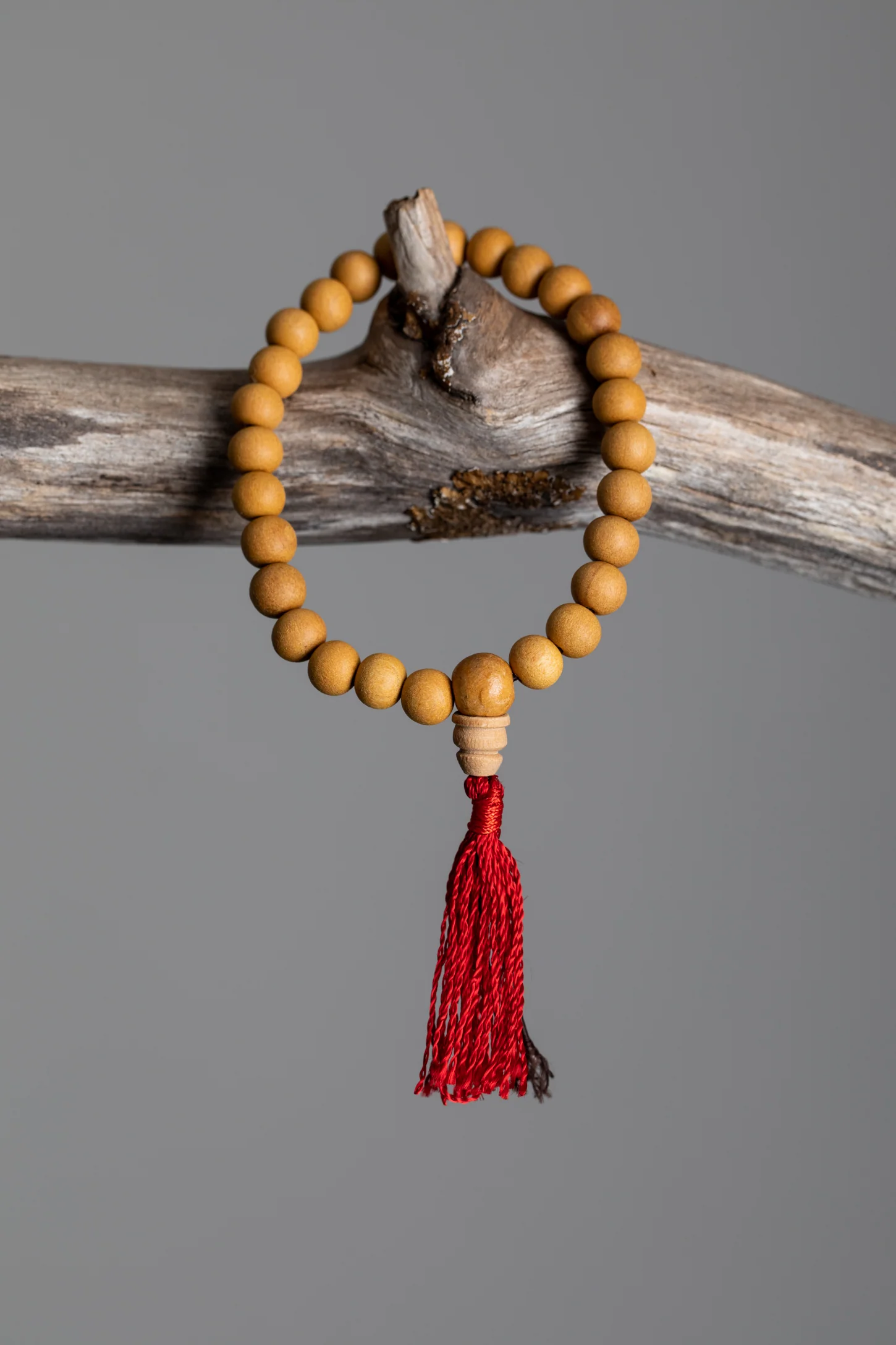 Each of these mala bracelets is handmade with handcrafted mala beads strung together with a red tassel.